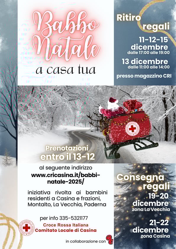 Anche quest'anno CRI Casina assieme a Quad Carpineti ripropone l'iniziativa "BABBO NATALE A CASA TUA!" riservata ai residenti del comune e frazioni di CASINA(RE) e per l'area sud del comune di Vezzano sul Crostolo ( LA VECCHIA -PADERNA-MONTALTO).